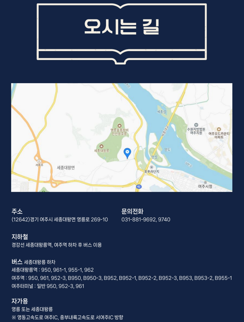 - 버스 : 여주역 → 980번 버스 이용 → 세종대왕릉 하차