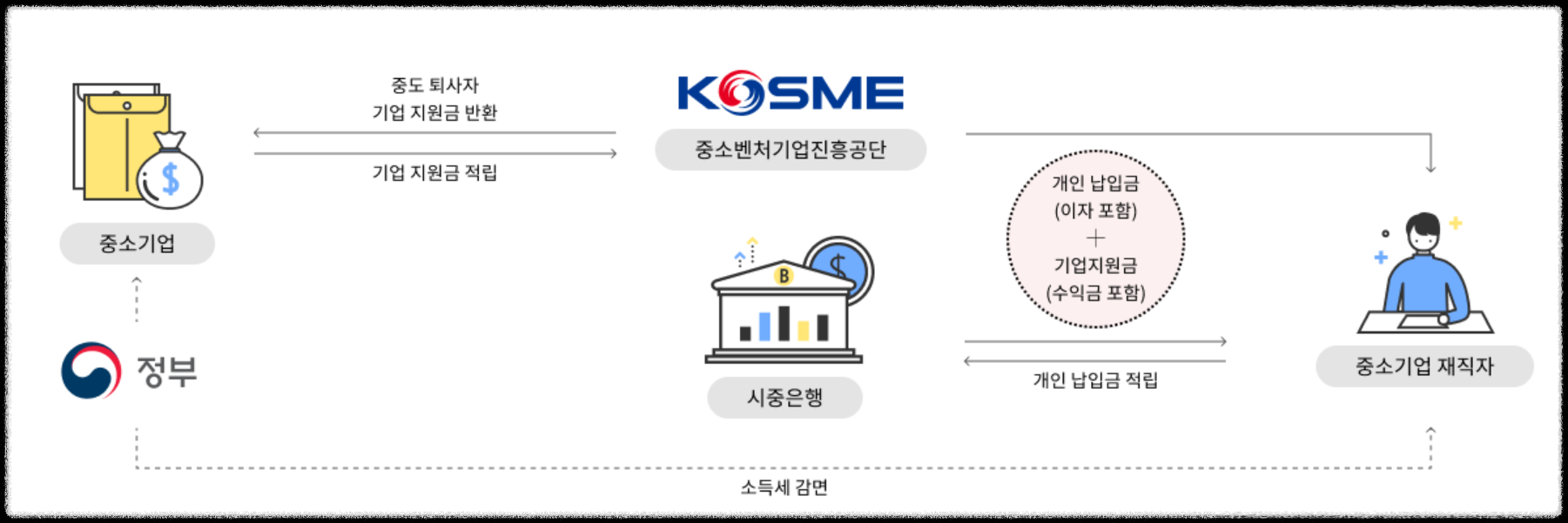 재직자 납입금 + 은행 금리우대 + 기업지원금(재직자 납임금의 20%) + 정부 세제지원(손비인정, 소득세 감면)