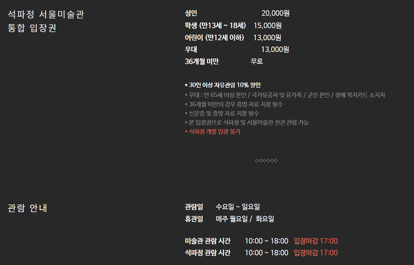 - 입장료: 성인 20,000원 / 청소년 15,000원 / 어린이 13,000원