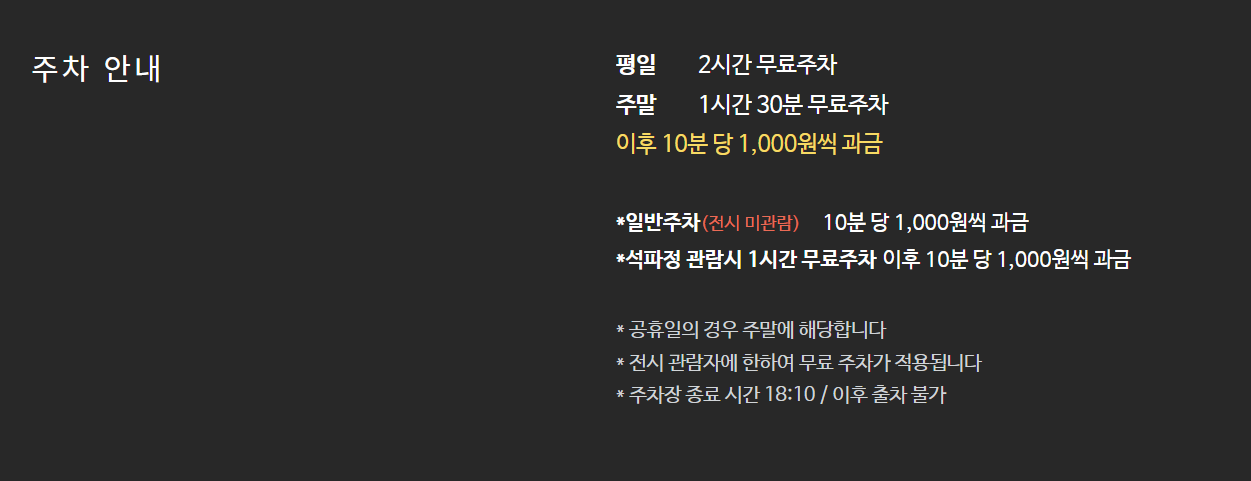 - 관람 시간: 오전 10시 ~ 오후 6시 (월요일, 화요일 휴관)